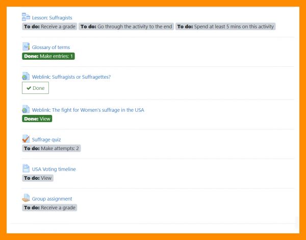 - Улучшено завершение активности. Благодаря четкому отображению информации о сроках выполнения задания и требований к завершению как на странице курса, так и внутри задания, студенты могут быстро увидеть, что им нужно сделать для завершения курса и когда.