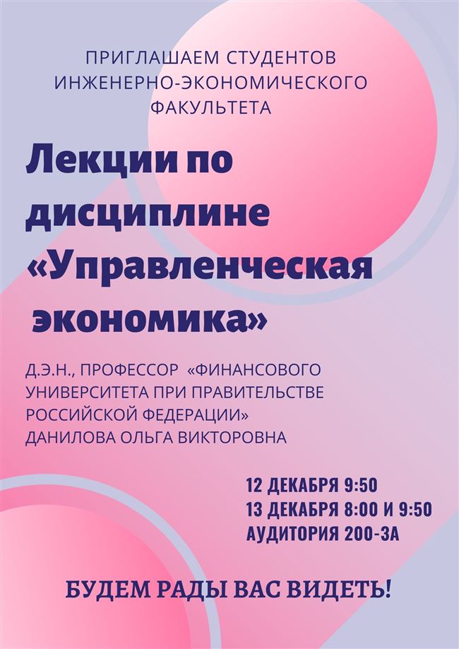 12 и 13 декабря на инженерно-экономическом факультете пройдет познавательный курс лекций по дисциплине "Управленческая экономика". Будет раскрыто множество важнейших вопросов, касающихся управления организацией, в том числе и частые ошибки руководства при принятии управленческих решений.