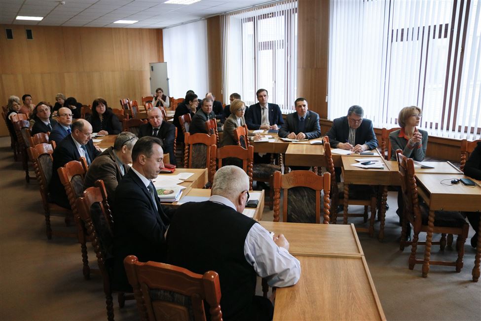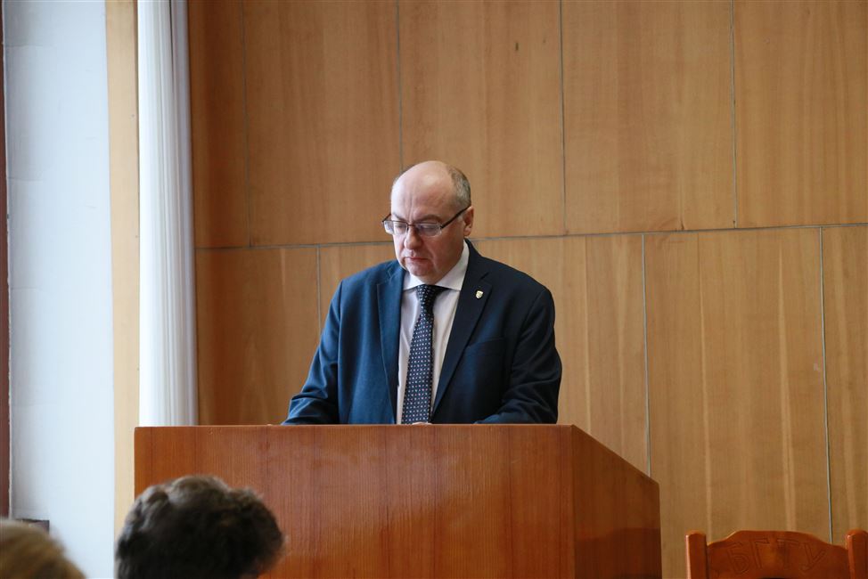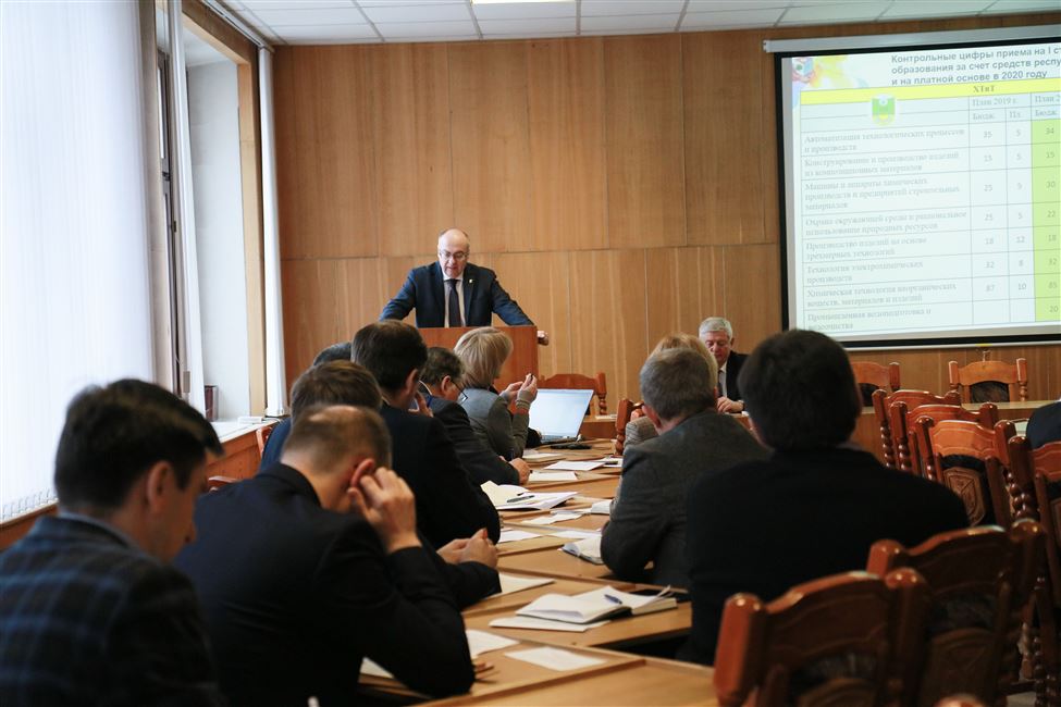 По первому вопросу порядка дня выступил проректор по учебной работе Андрей Сакович. В докладе было отмечено, что цифры приема по сравнению с 2019 годом существенно не изменились. На I ступень высшего образования прием будет производится по 30 специальностям. Произошло увеличение бюджетных мест на 8 человек на дневную форму обучения (1060 чел.), на 30 человек на заочную (полную) платную форму (150 чел.).