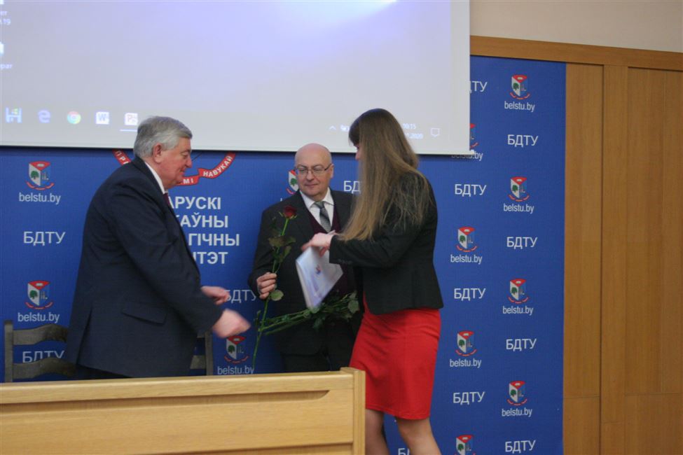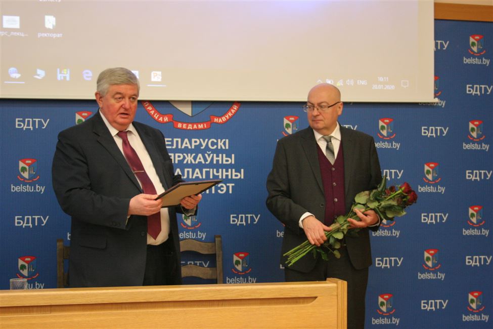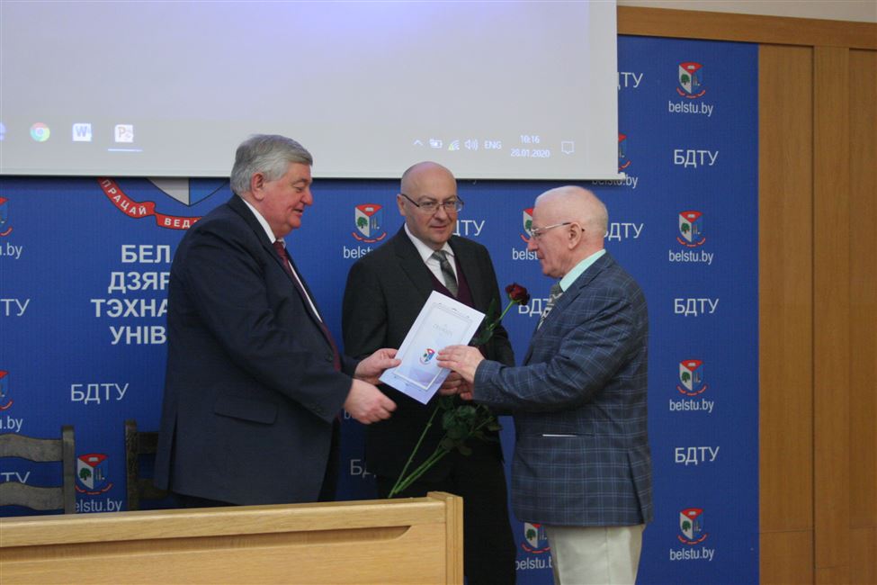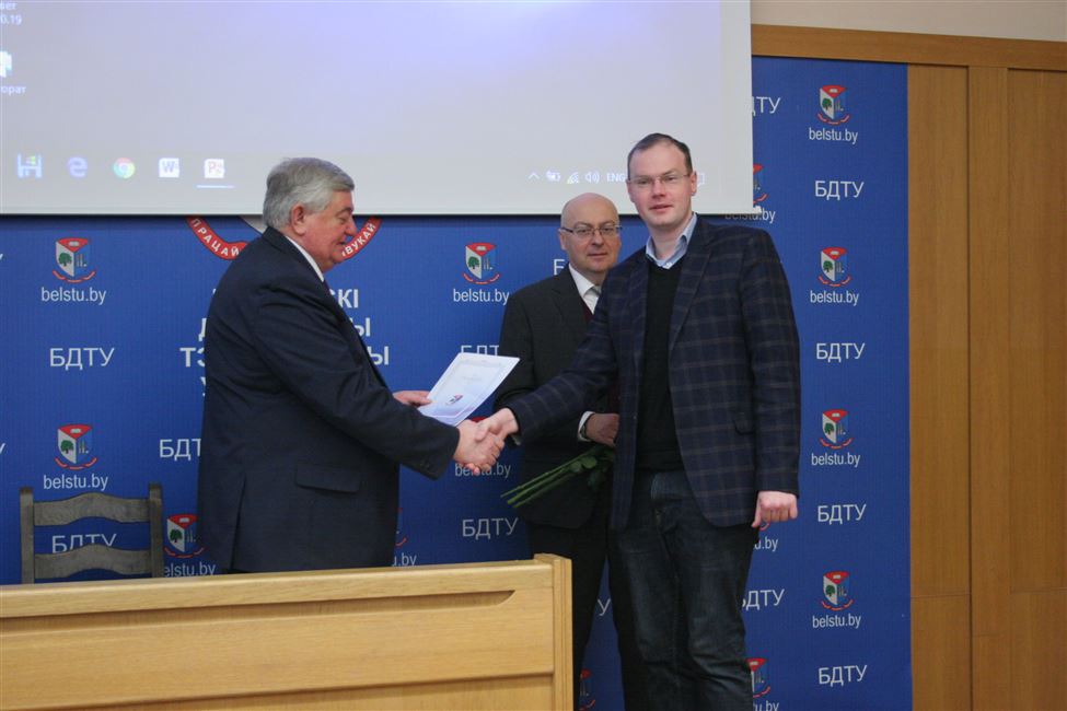 - Почетной грамотой УО «Белорусский государственный технологический университет» награжден заведующий кафедрой химической переработки древесины Флейшер Вячеслав Леонидович за значительный вклад в разработку новых научных направлений, высокие показатели в развитии научной, научно-технической и инновационной деятельности, подготовку высококвалифицированных научных кадров для народного хозяйства Республики Беларусь и в связи с днем белорусской науки;