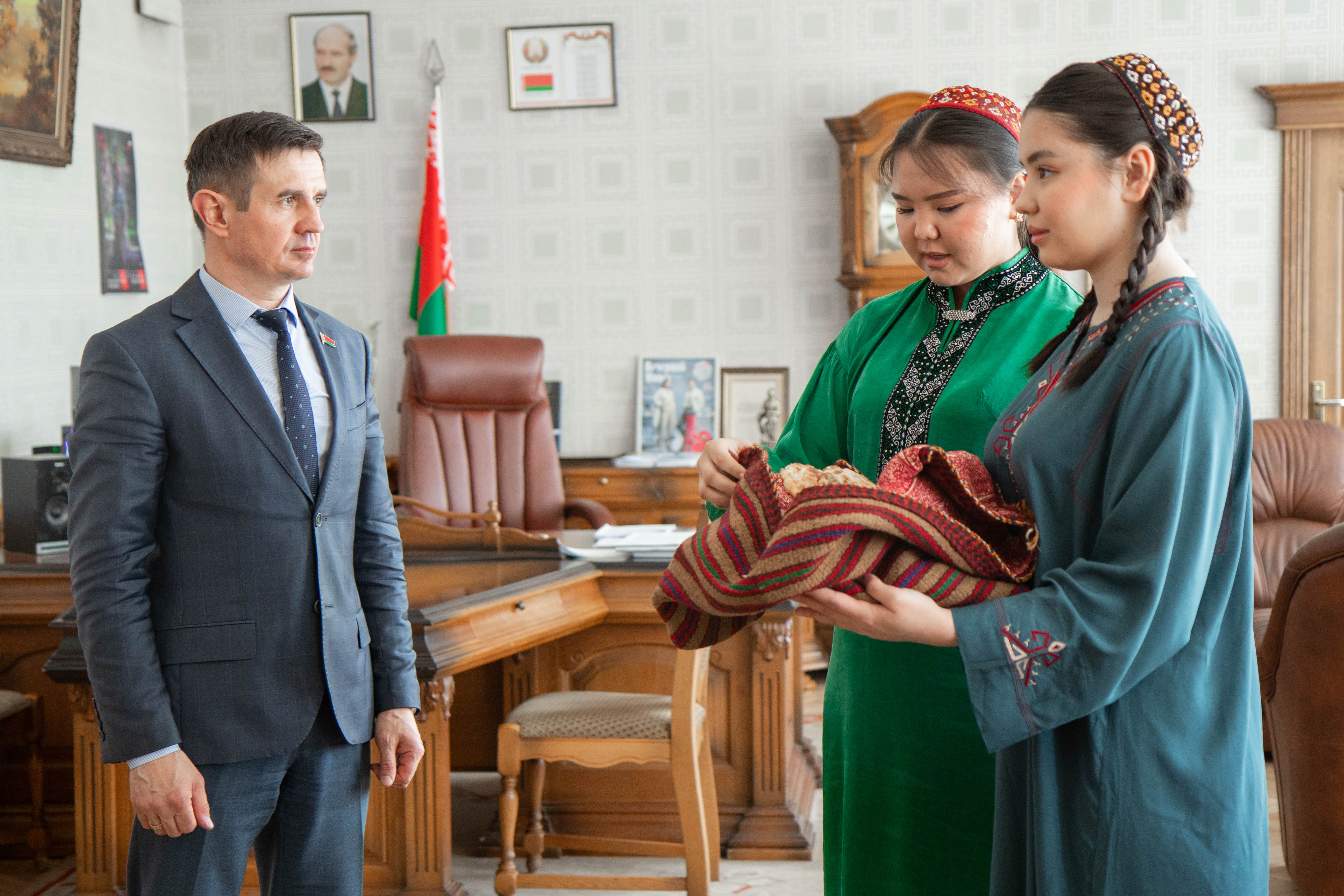 В рамках «Фестиваля народов мира» студентки из Туркменистана подготовительного отделения БГТУ своими руками испекли и угостили ректора БГТУ традиционным туркменским хлебом — лепешками по древнему рецепту. Сергей Антонович выразил благодарность девушкам за их тепло и гостеприимство, пожелал им скорейшего поступления в университет и успехов в будущей учебе.