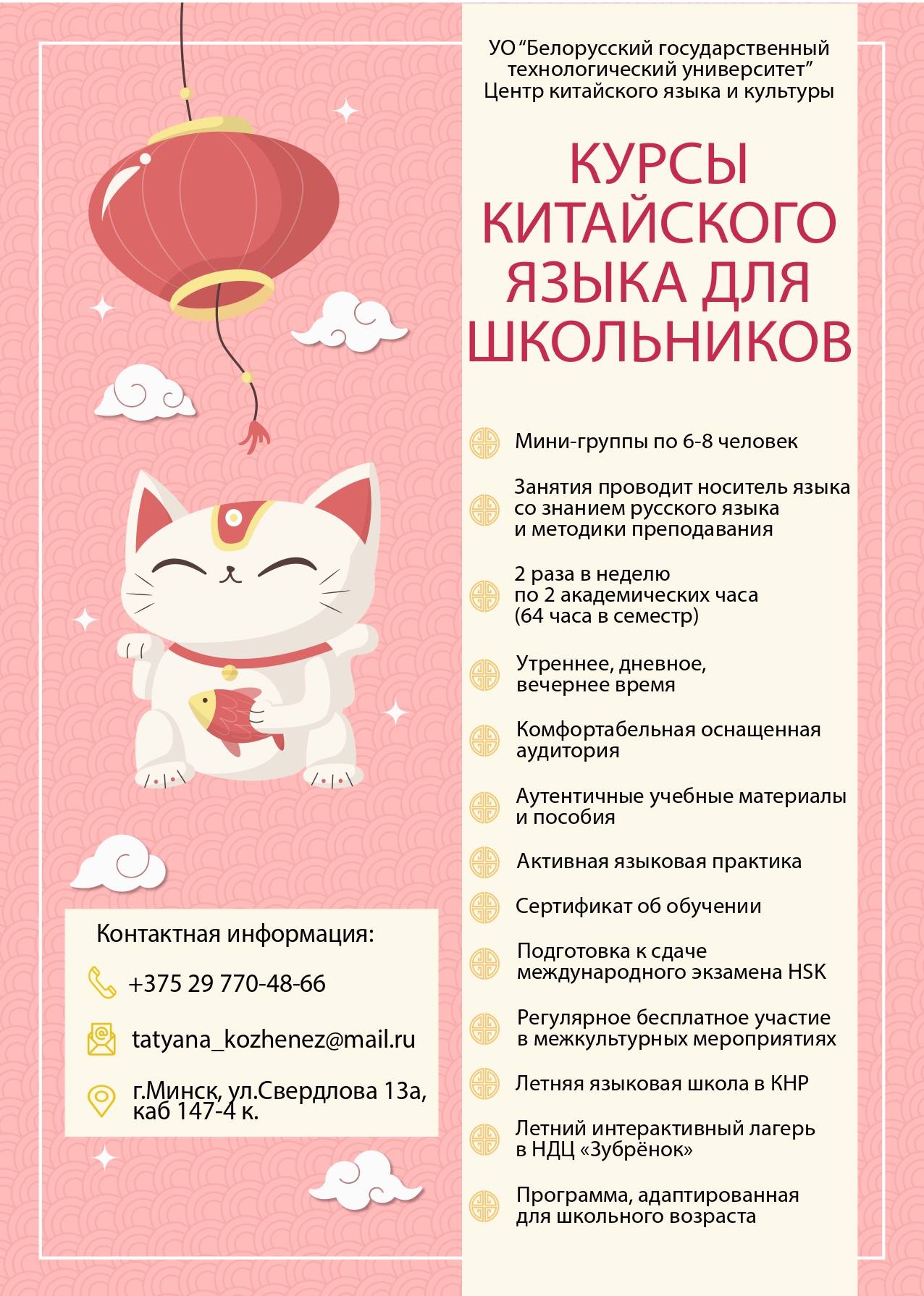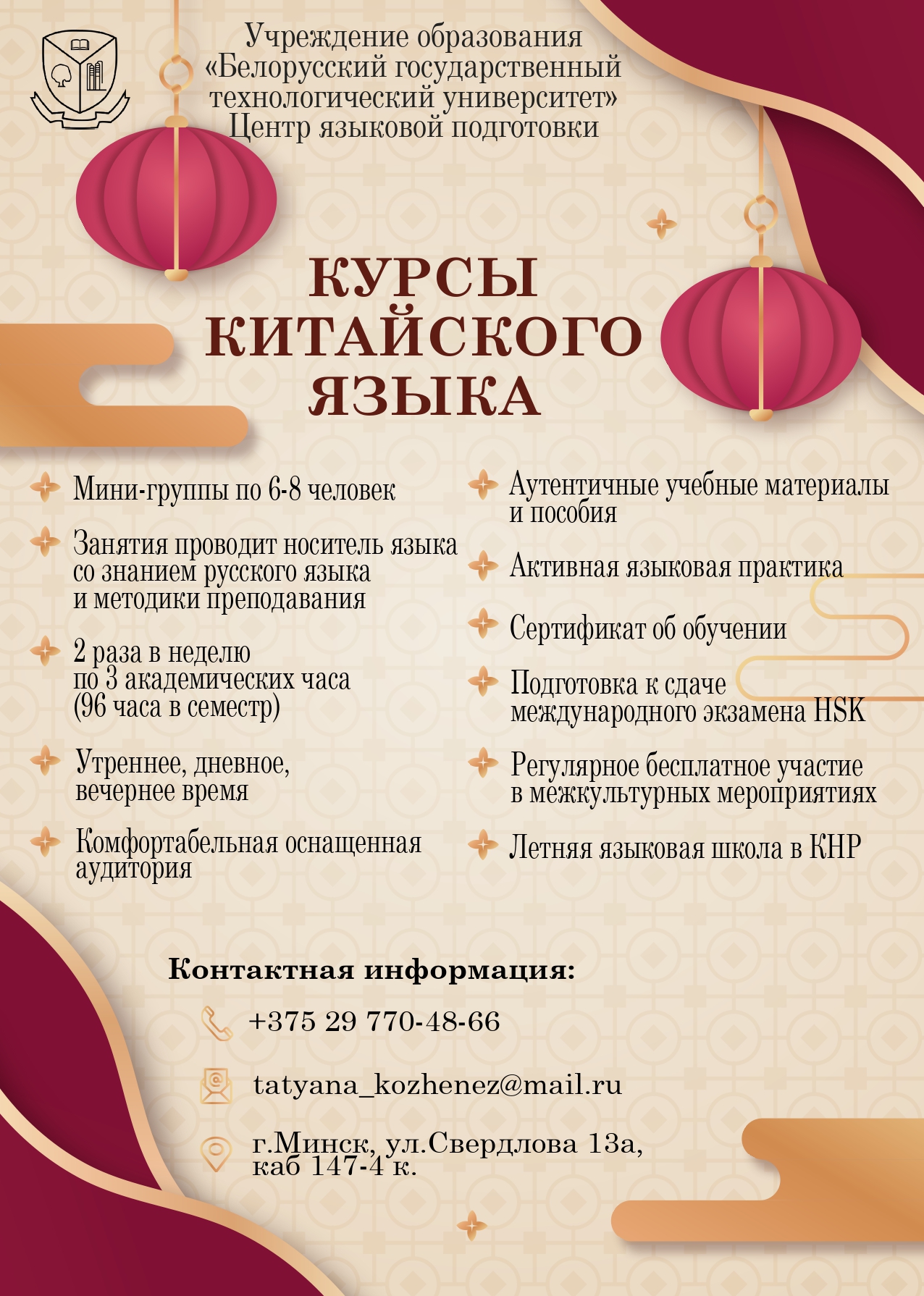 В Центре китайского языка и культуры БГТУ идет запись на курсы изучения китайского языка. Предлагаем образовательные программы по изучению китайского языка, разработанные на основе стандартов Главного управления Институтов Конфуция/Ханьбань, в содержание которых входит формирование знаний в области иероглифики, фонетики, грамматики, расширение лексического запаса, совершенствование навыков письменной и разговорной речи.