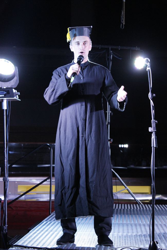Следующим на сцену вышел магистр в мантии, чтобы поздравить всех первокурсников и пожелать им отличной учебы.
