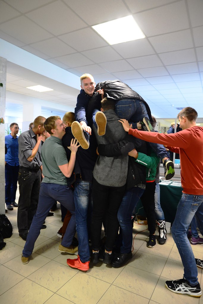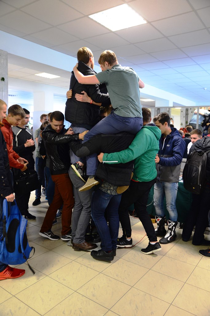 Первый конкурс "Сколько весит дружба" заключался в том, чтобы на весах с площадью поверхности 0.3 кв.м стало (разместилось) как можно больше человек из одной учебной группы или компании. Победа присуждалась группе с наибольшим суммарным весом.