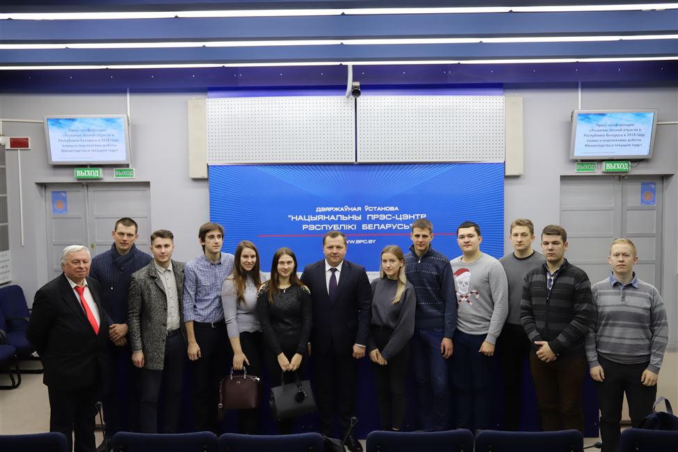 14 февраля 2019 г. в Национальном пресс-центре Республики Беларусь состоялась пресс-конференция Министра лесного хозяйства Дрожжа Виталия Александровича на тему «Развитие лесной отрасли в Республике Беларусь в 2018 г., планы и перспективы работы Министерства в текущем году». В пресс-конференции Министра приняли участие и студенты 4 курса лесохозяйственного факультета БГТУ. Им было интересно из первых уст Министра узнать о работе Министерства в истекшем году и задачах и планах на этот год. Ведь через полгода они станут молодыми специалистами и станут приумножать наш лесной фонд страны.