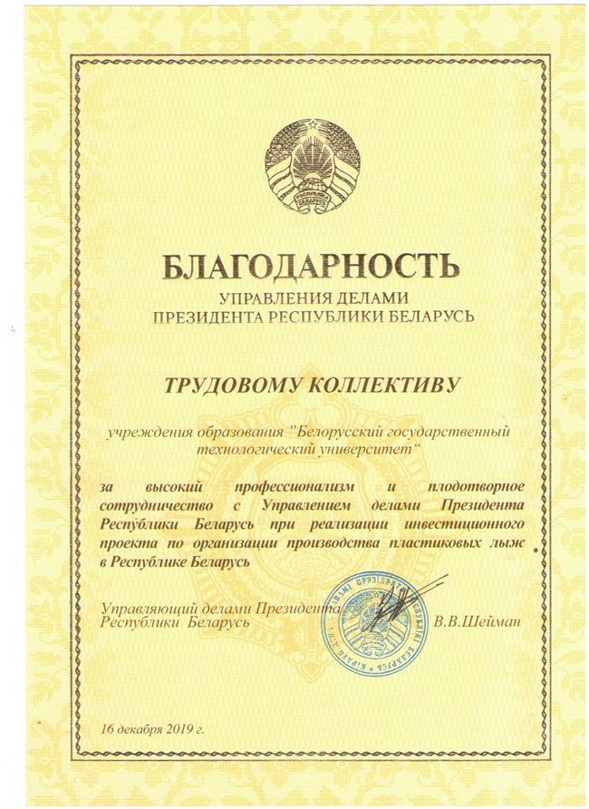За высокий профессионализм, инициативность и плодотворное сотрудничество с Управлением делами Президента Республики Беларусь при реализации инвестиционного проекта по организации производства пластиковых лыж благодарственные грамоты от имени Управляющего делами Президента Республики Беларусь В.Н. Шеймана вручены: