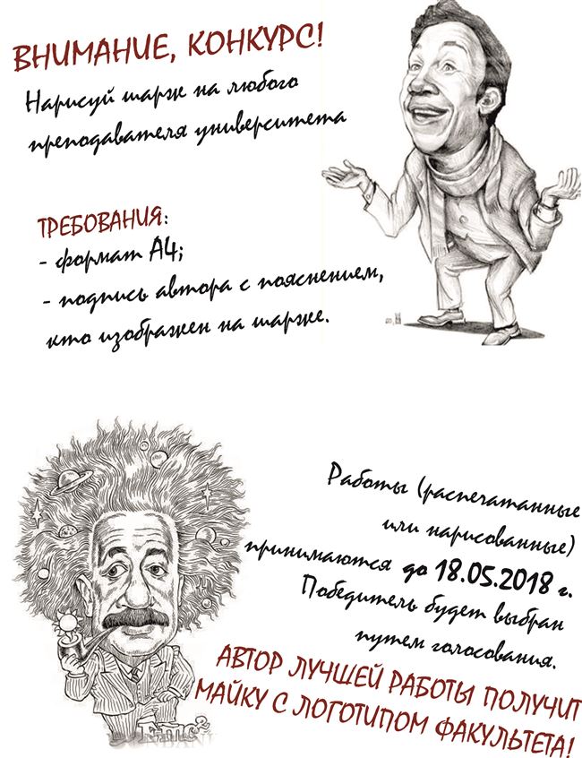 В преддверии празднования Дня Рождения факультета ИТ мы объявляем конкурс "Шарж на любимого преподавателя университета". Работы принимаются в бумажном виде формата А4 (нарисованные или напечатанные). Свои работы необходимо принести в деканат факультета ИТ. 18 мая путем голосования на одной из локаций в университете определим лучшую работу. Автор лучшей работы получит майку с логотипом факультета ИТ. Ждём ваших работ!!!