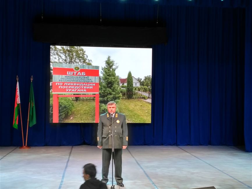 На торжественном мероприятии Министр лесного хозяйства Михаил Амельянович поблагодарил за огромную работу по ликвидации последствий урагана, проделанную лесоводами и добровольцами, наградил работников отрасли за значительный вклад, внесенный в разработку ветровально-буреломных лесосек и посадку лесных культур на территориях, поврежденных ветром.