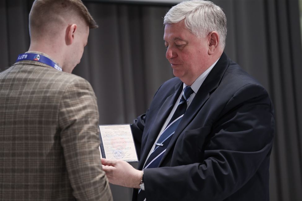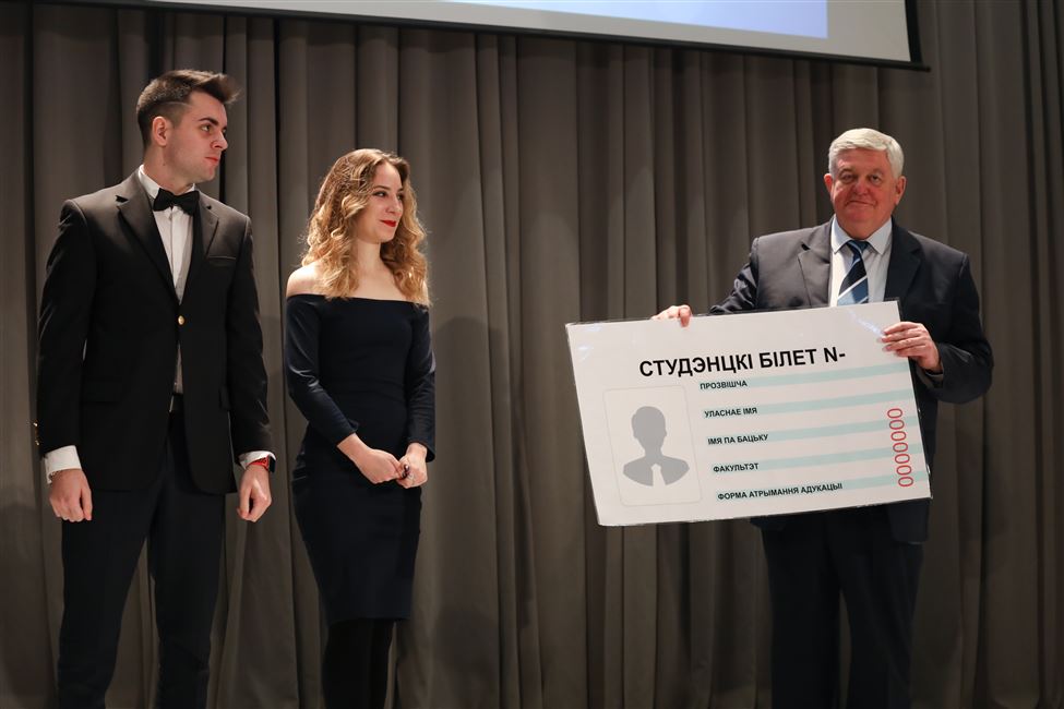 Символическое окончание университета ознаменовала передача студенческого билета ректору И.В.Войтову студентами БГТУ Станько Марией и Кузьмицким Домиником.